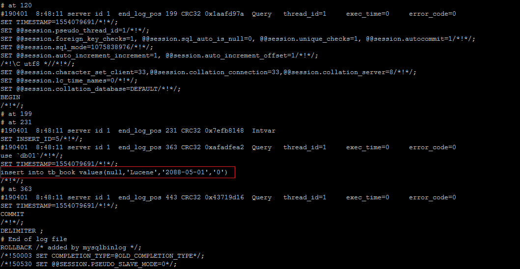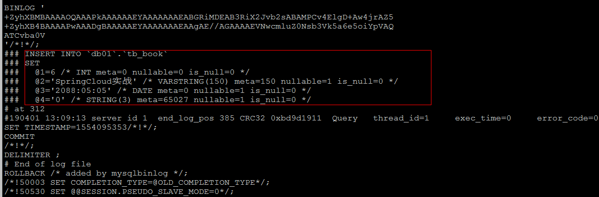 如果日志格式是 ROW , 直接查看数据 , 是查看不懂的 ; 可以在mysqlbinlog 后面加上参数 -vv