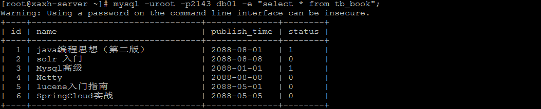 mysql -uroot -p2143 db01 -e "select * from tb_book";
