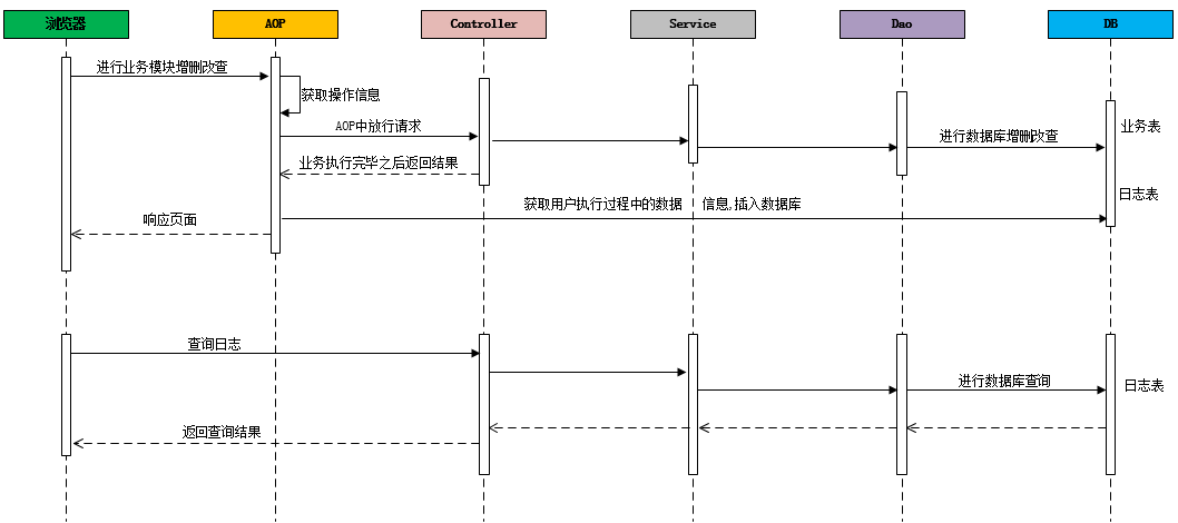 记录系统中的日志信息,可以通过Spring 框架的AOP来实现。具体的请求处理流程,如下: