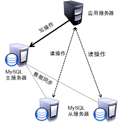 在Mysql主从复制的基础上,可以使用读写分离来降低单台Mysql节点的压力,从而来提高访问效率,读写分离的架构如下: