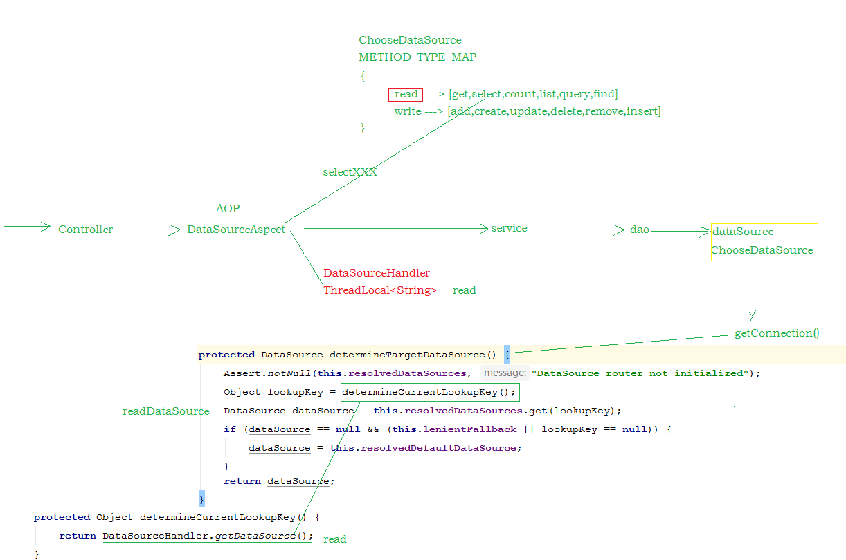 对于读写分离的实现,可以通过Spring AOP 来进行动态的切换数据源,进行操作 :