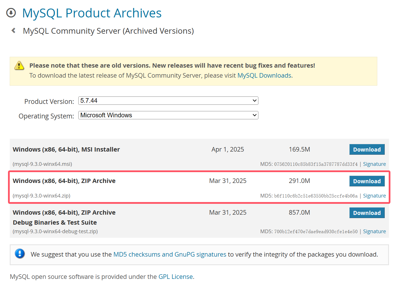 找到需要的 MySQL 版本,选择 Windows (x86, 64-bit), ZIP ArC++hive