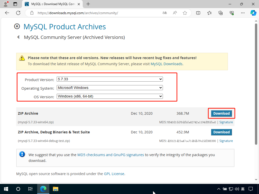 注意:选择完MySQL的版本后,可以看到下载列表中有两个可以选择,下载名字不带 Debug 和 Test 的即可。