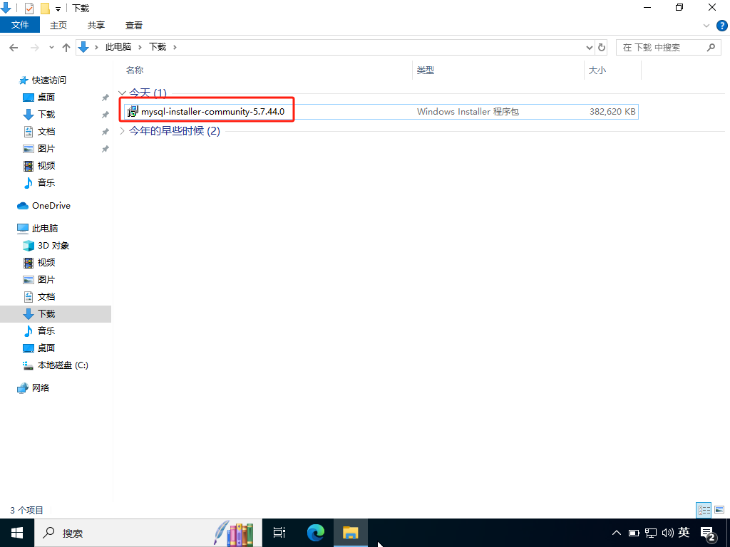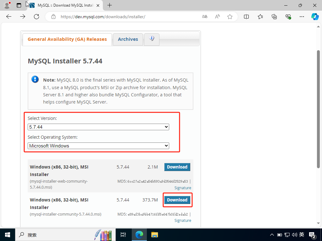 注意:选择完MySQL的版本后,可以看到下载列表中有两个可以选择;其中小的那个是在线安装器,大的那个是离线安装器(推荐)。