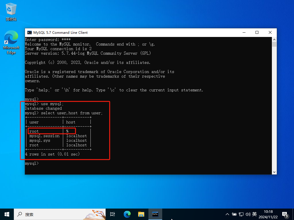 如上图所示,登录新 MySQL 成功。此外,登录信息还显示目前的版本号为 5.7.44 。