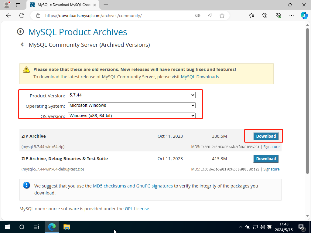 如上图所示,旧版本是 5.7.33 的,新版本应该选择 5.7.x 中最新的,本例为 5.7.44 。
