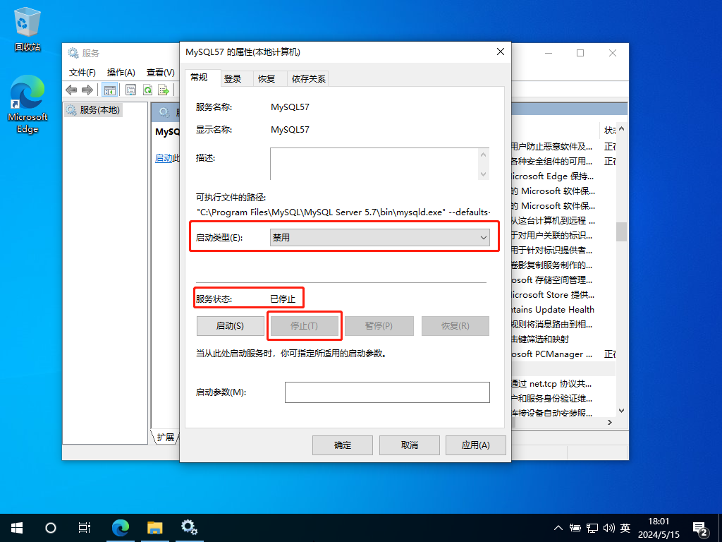 如上图所示,启动类型设为“禁用”,服务状态点击停止。