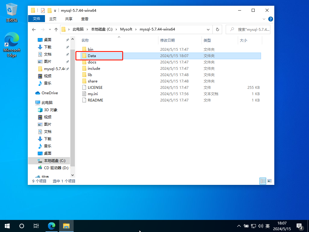 如上图所示,本例将 MySQL 的压缩包的文件解压到 MySoft 目录下,这个操作相当于指定了 MySQL 的安装目录。