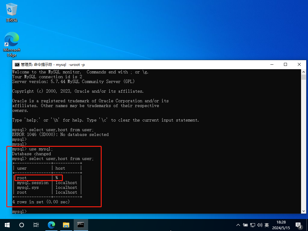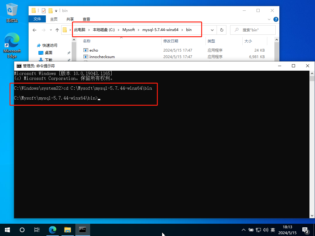 如上图所示,在“命令提示符”窗口中,进入新 MySQL 的 bin 目录(本例为:C:\MySoft\MySQL-5.7.44-winx64\bin)