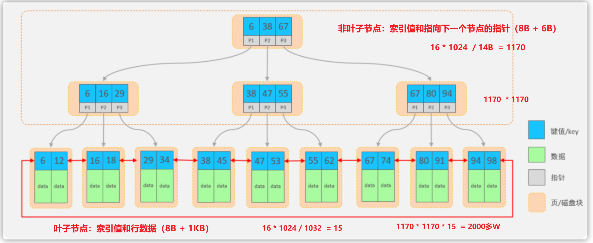 为什么采用B+树?B+树的非叶子节点存储的是索引|和指向下个索引的指针,叶子节点存储的是索引和数据,可以尽量使用深度低的树存储大量数据,树的深度越